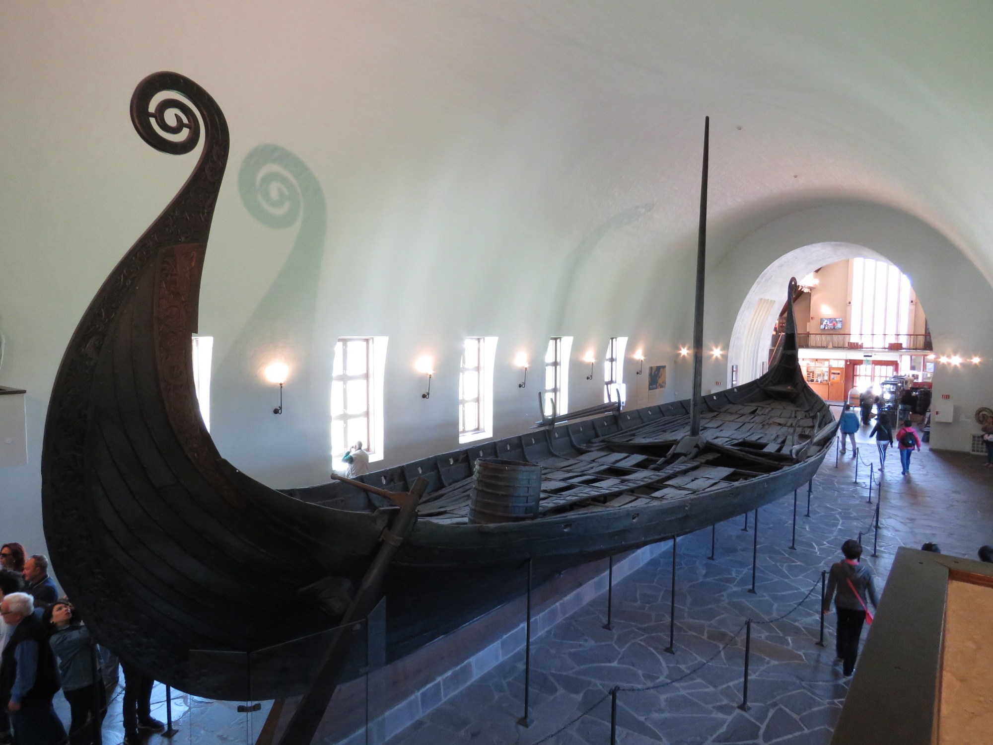 It is startling to walk into a room and come face to face with a real live Viking ship. I can’t imagine what you might have thought if you happened to be on shore and saw Viking ships approaching… They are definitely intimidating. One of the ships was purely ceremonial and is fairly shallow – for slowly gliding across becalmed fjords, I suppose. It has the richest decoration complete with the carved serpents at prow and stern. Just like the movies, no really, it is! The other two ships were built to withstand journeys on the open ocean. They have much higher sides and are a size or two larger than the ceremonial ship. Interesting tidbit, there are no benches on these ships, the crew sat on their sea-chests! Conservation of space, no doubt.