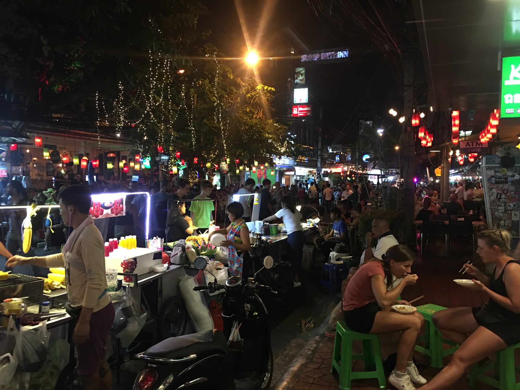 The taxi driver *may* have been trying to help me out by explaining that there was a shuttle or a bus or some type of conveyance to my hotel, over in some other arrival area. I doubt the sincerity of 99% of the taxi drivers pretty much anywhere in the world – so we made a deal and he got me to the hotel. Well, he got me close to the hotel. Because this hotel is down a street that is blocked off so all the backpacker types can revel outdoors in the open bars and purchase goodies from all the street vendors. Goodies in Thailand can be quite exotic – like torched scorpions on a stick. I kid you not, it’s a real thing. I was concerned when the driver told me I just needed to walk down the street – because now it’s 3:30am (in my head) and I’m thinking a lone woman and her luggage wandering around at night may not be advised. But it’s Bangkok and I recognize the atmosphere and lo and behold a few hundred feet down the street I find my destination. Weary, exhausted and hungry – I am finally able to relax and sleep!
